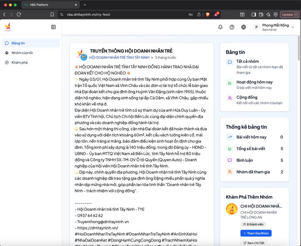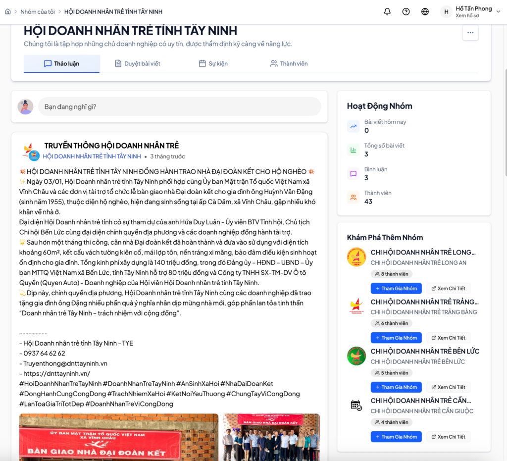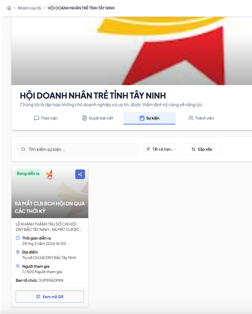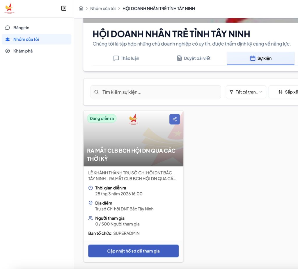 Anh/chị truy cập vào “Nhóm của tôi” sau đó vào “HỘI DOANH NHÂN TRẺ TỈNH TÂY NINH”, vào thẻ “Sự kiện” để theo dõi các sự kiện đã được tạo của Hội.