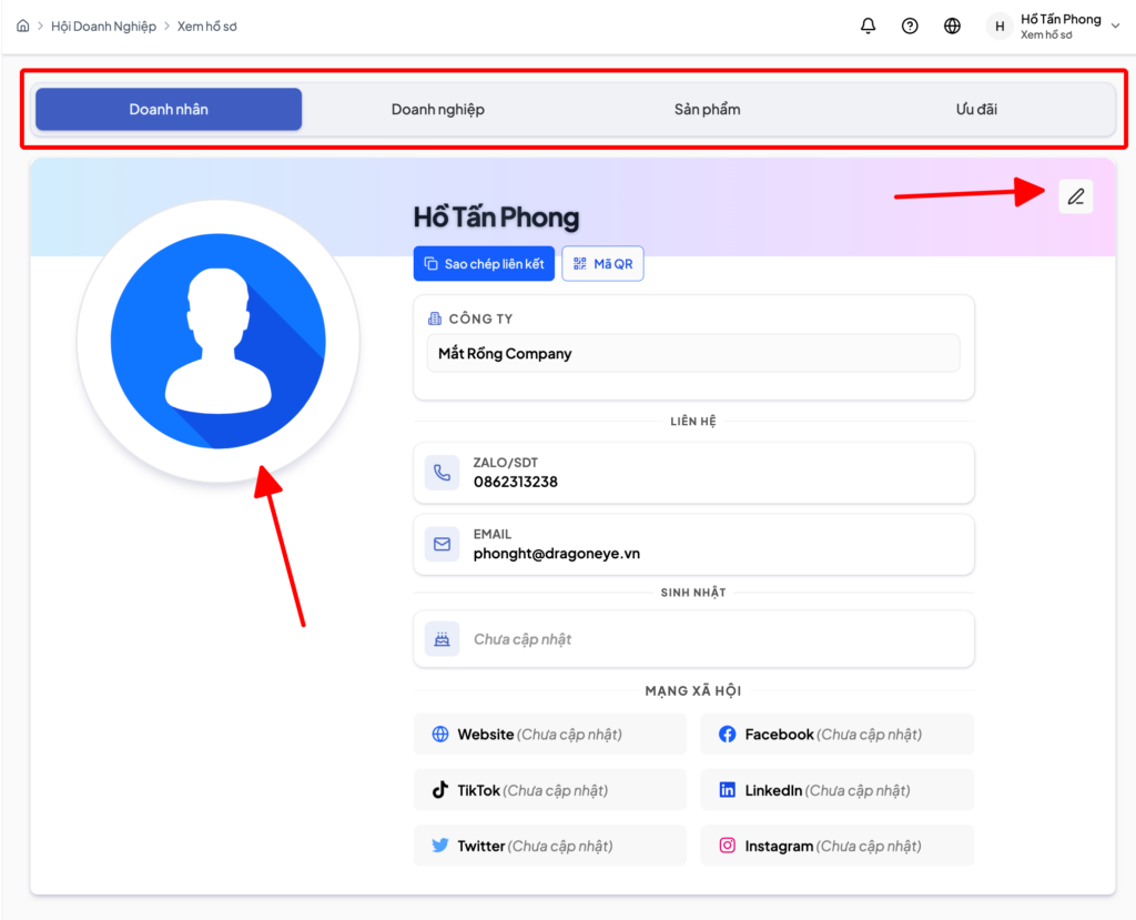 Anh/chị cập nhật đầy đủ các thông tin cá nhân & doanh nghiệp theo từng bước trên màn hình từ Doanh nhân -> Doanh nghiệp -> Sản phẩm đến Ưu đãi.