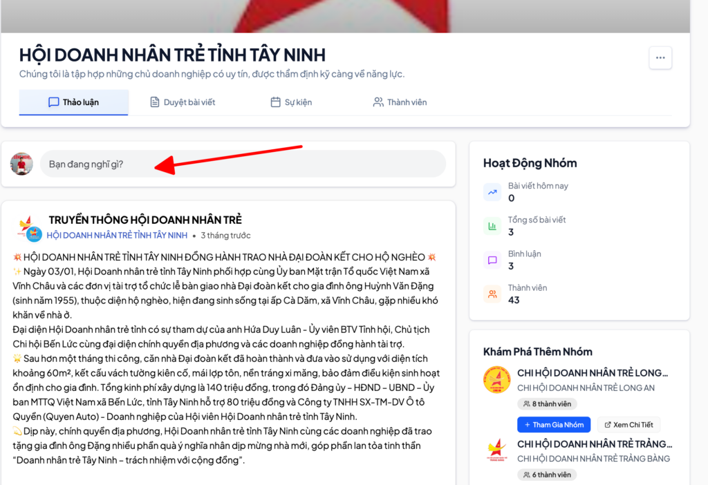 Bây giờ, hội viên có thể tham gia hoạt động cộng đồng bằng cách, ở bảng tin hội viên có thể đăng bài viết để quảng bá thông tin sản phẩm/ dịch vụ doanh nghiệp mình đang cung cấp.