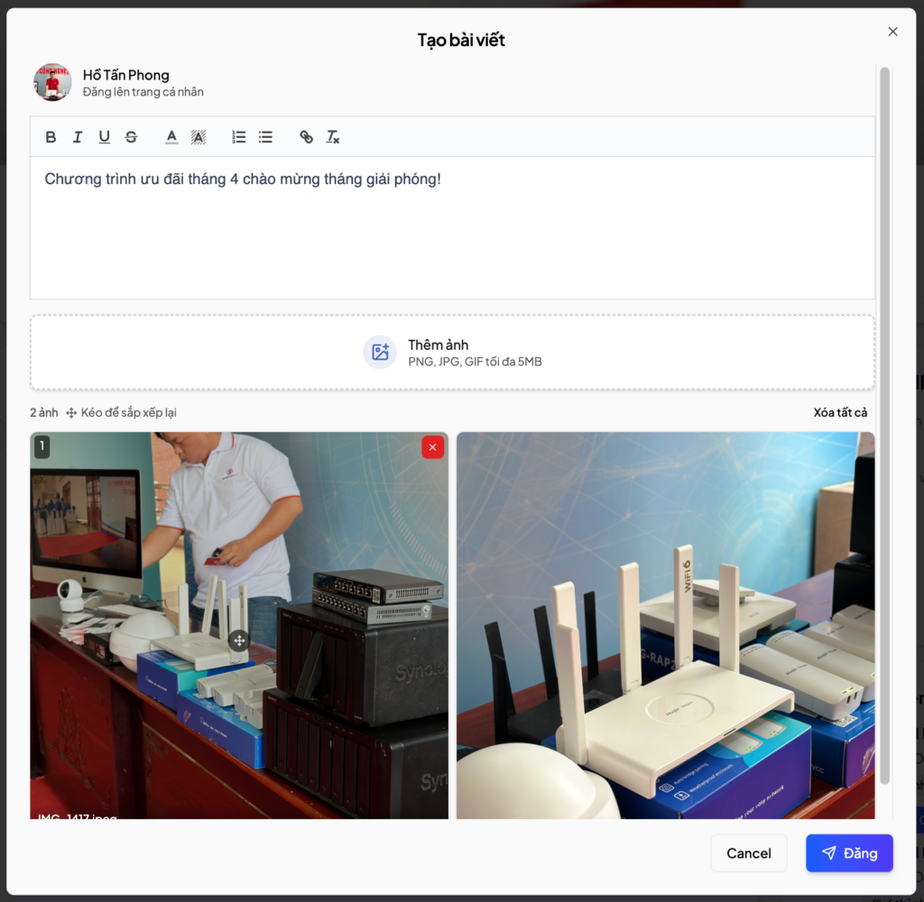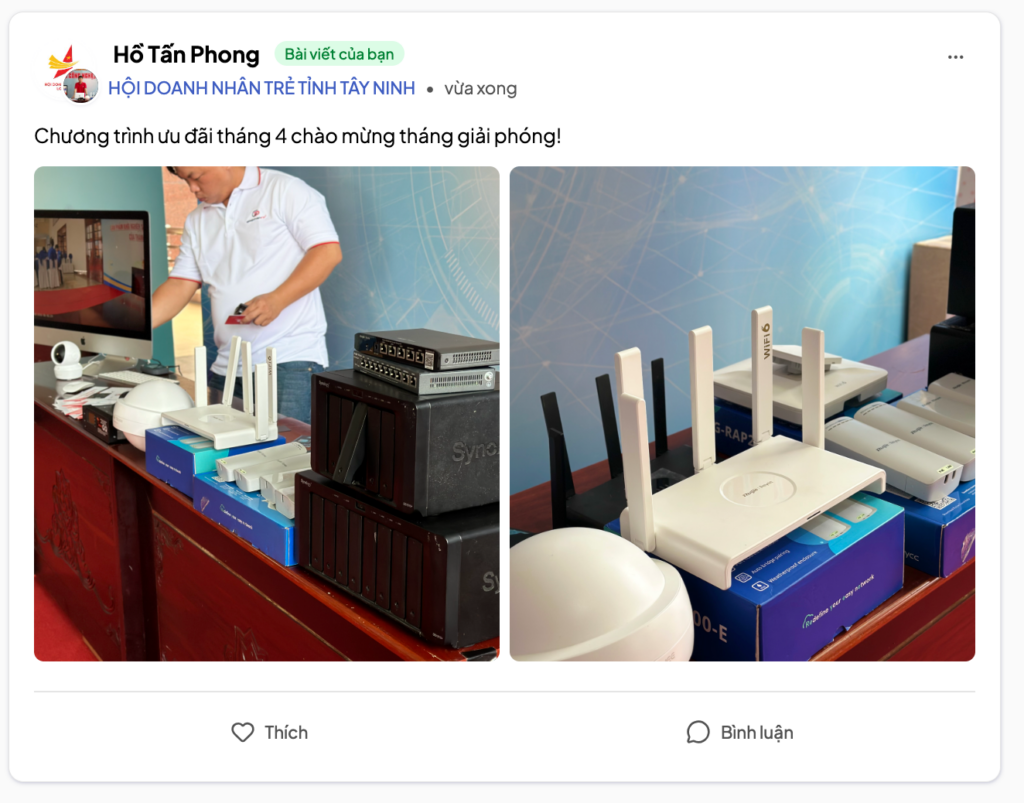 Anh/chị có thể đăng bài viết đính kèm hình ảnh sản phẩm/dịch vụ và các chương trình khuyến mãi của mình để giới thiệu đến các hội viên khác.