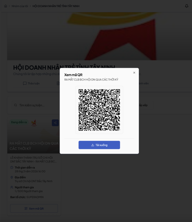 Sau khi cập nhật xong, anh/chị sẽ thấy qrcode của mình, anh/chị vui lòng chụp lại màn hình hoặc chọn tải xuống qrcode để cung cấp cho Ban hỗ trợ checkin tại sự kiện.