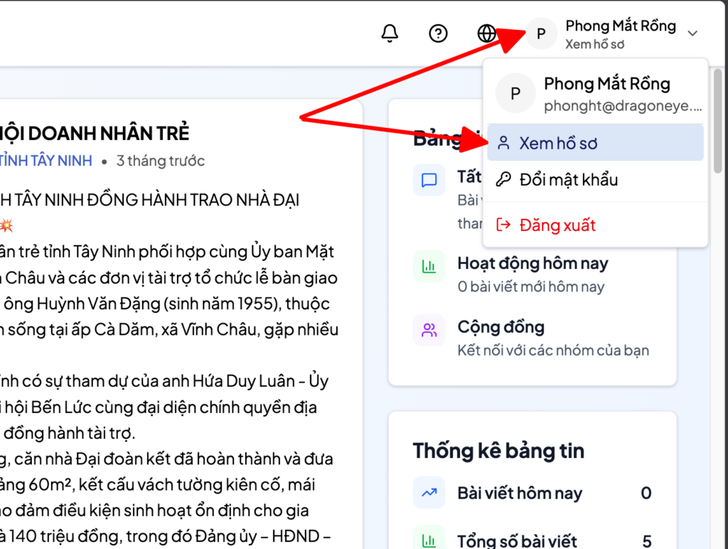 Truy cập góc phải màn hình, nơi có tên hội, click vào để chọn “Xem hồ sơ”